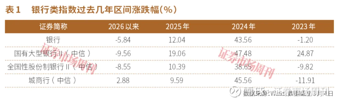 2026年以来,银行板块表现不尽如人意。截至3月4日,银行指数年内下跌了5.84%。其中国有大型银行下跌幅度最大,为9.56%;其次为全国性股份制银行,下跌8.55%。