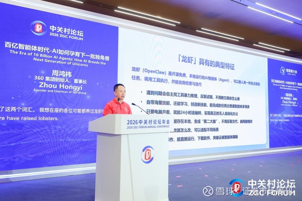 在日前举办的2026中关村论坛年会全球独角兽企业大会上,360集团创始人周鸿祎发表主题演讲,围绕以“龙虾”(OpenClaw)为代表的新一代智能体技术,系统阐述了人工智能加速演进所带来的产业变革机遇。他指出,2026年“龙虾”的走红,标志着智能体技术完成从极客圈层向社会大众的成功“破圈”。这不仅完成了智能体的大众普及,更将推动整个互联网基础设施、软件行业乃至各实体产业的全面重构,其中蕴藏着孕育新一代独角兽的海量机会。