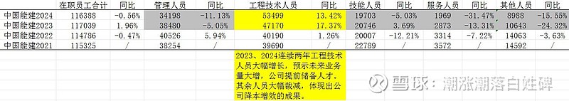 二、另一个支撑“中国能建未来业绩继续增长”这一结论的是“在职员工变化情况”:中国能建2021-2024年间,管理人员、服务人员和其他人员均被大幅裁减或转岗,工程技术人员大幅增长。这表示公司不直接产生业绩的员工大幅减少,直接产生业绩的员工大幅增长。一方面是公司降本增效的成果体现,另一方面预示着公司为应对未来业务大幅增长已提前储备人才。(详见图3、图4)