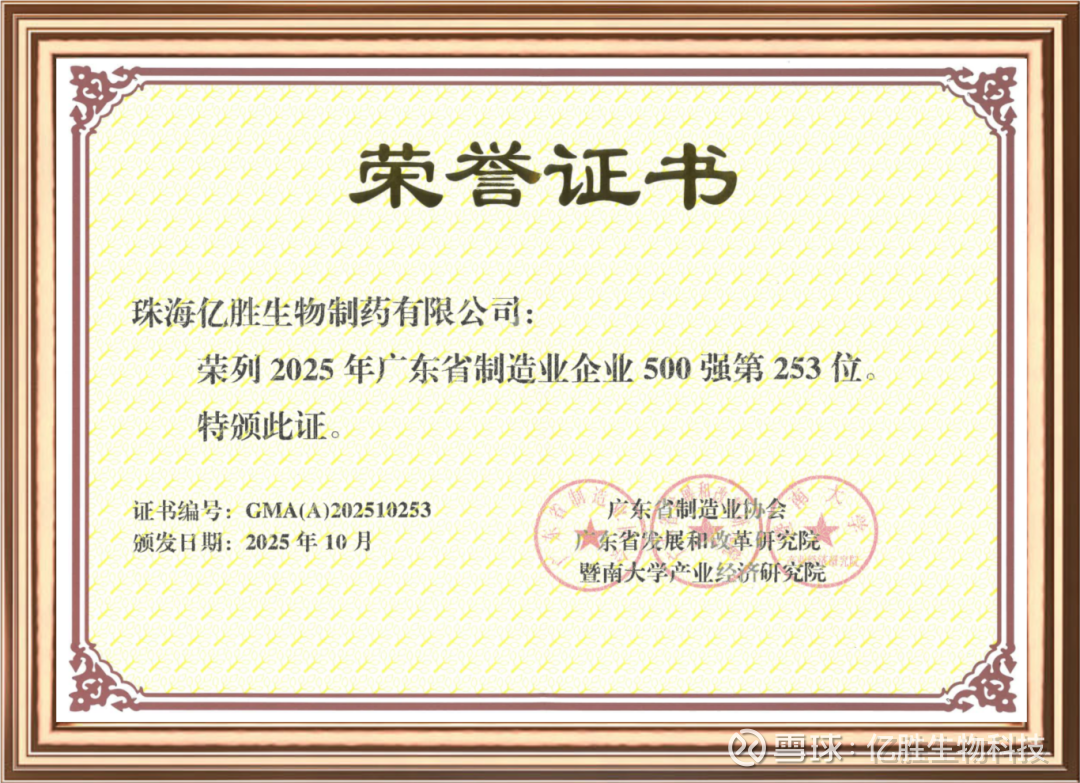 近日,暨南大学产业经济研究院、广东省制造业协会、广东省发展和改革研究院联合发布《2025年广东制造业500强企业研究报告》。亿胜生物科技有限公司(“亿胜生物”或“集团”,股票代码:1061.HK)间接全资附属公司珠海亿胜生物制药有限公司(“珠海亿胜”)凭借在复杂的外部环境下展现出强劲韧性和持续上升势头,再度跻身“广东制造业500强”榜单,居第253位,较2024年提升4个名次。