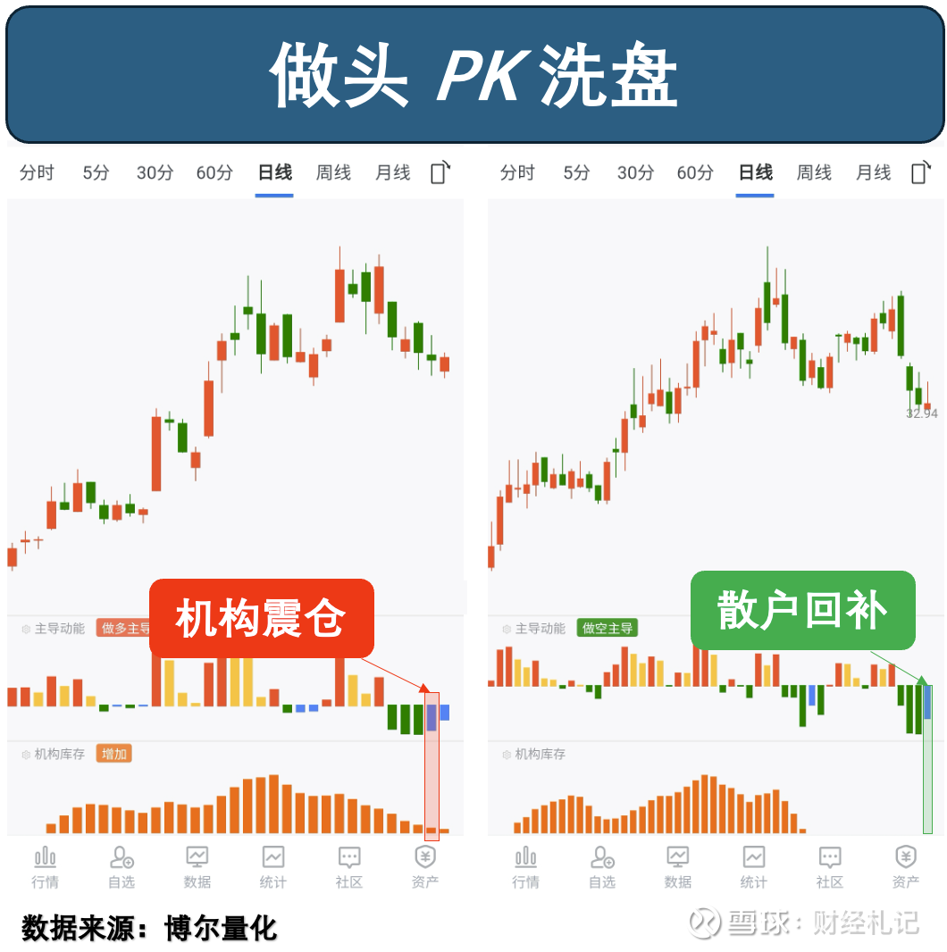 左侧出现蓝色回补柱伴随橙色机构库存,典型的机构震仓;右侧只有孤零零的蓝色柱体——那是散户在博反弹。结果呢?