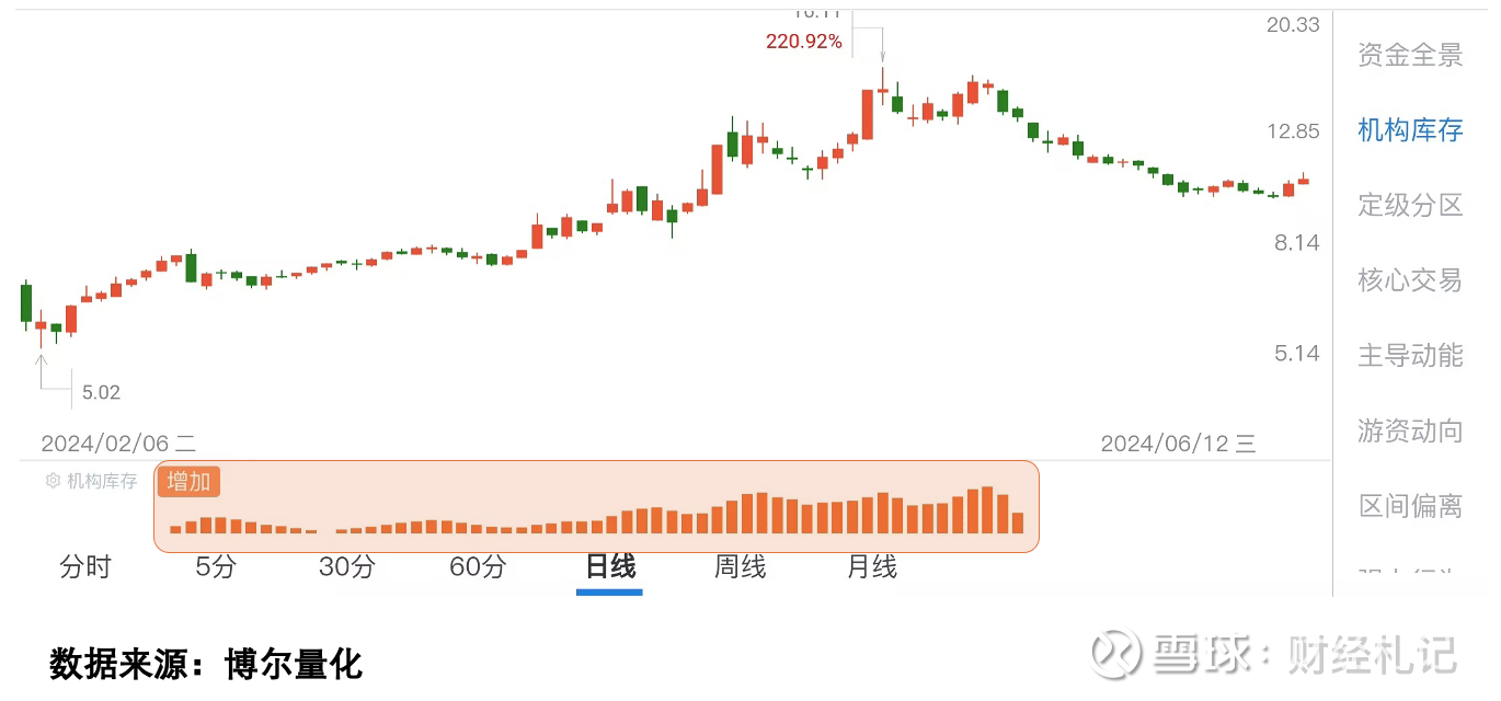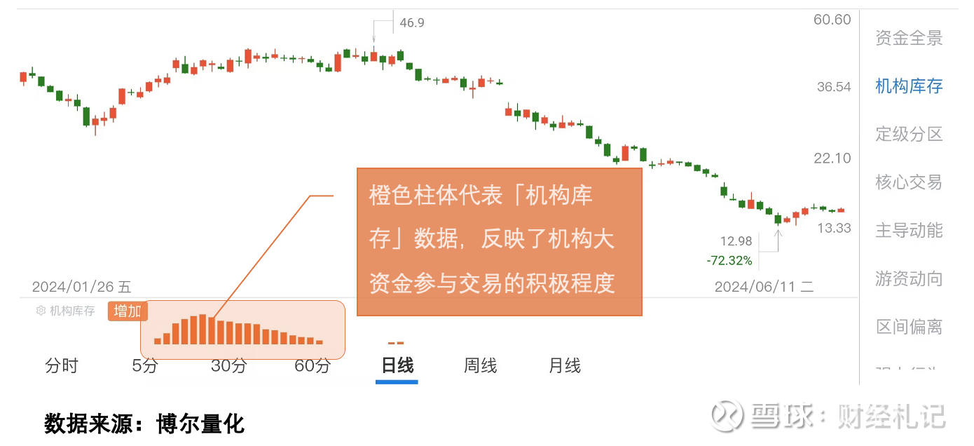 就拿紫天科技来说,8个交易日涨20%,多少人以为捡到宝了?结果从2月23日开始一路阴跌。为什么?看看它的「机构库存」数据就明白了: