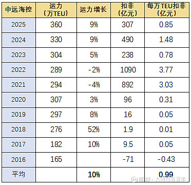 我认为,运力是给评估公司价值的关键,而且每万TEU的扣非净利润在数据观测上是存在均值回归的(也就是表中加粗的0.99亿元/万TEU)。