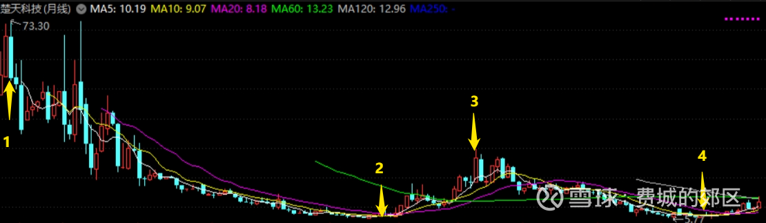 1、箭头1,从14年3月的73元,一路下滑到箭头2,20年4月的7元多,股价下跌了90%