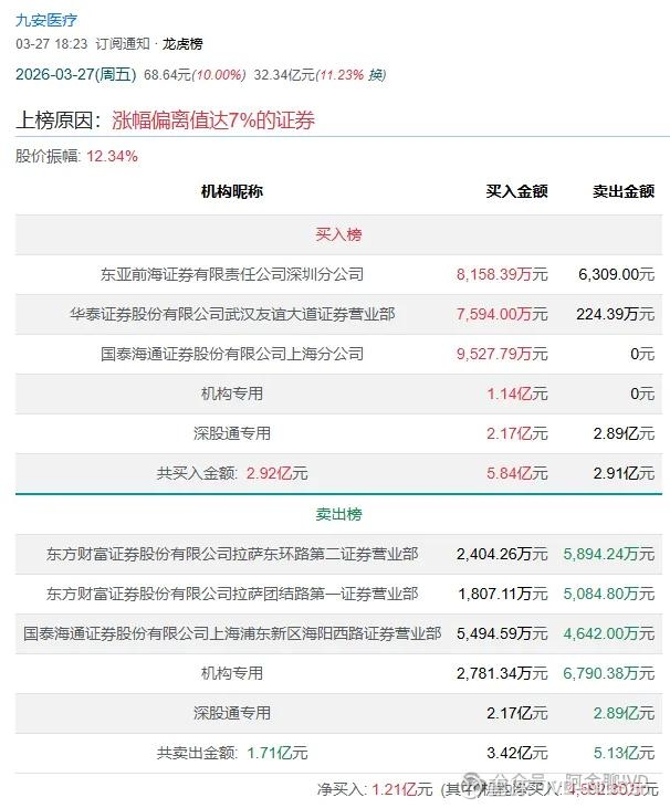 前不久才写过九安医疗,这不,才几天,又上龙虎榜,而且这次该板块两只股票九安医疗和热景生物同时上榜,九安医疗净买入1.2亿,热景生物净买入0.5亿