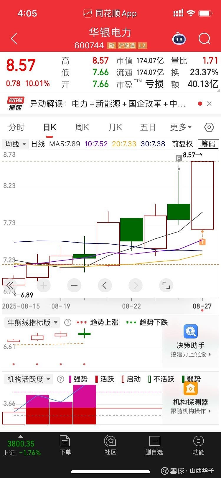 昨天我分三次建仓了600744华银电力!这个股冲高回落的厉害!有不少人出来嘲讽我!都说我被套了!气得我都把他们拉黑了!今天看来选择还是没有问题的,既赚了钱还躲过了大跌!所以说做好自己就可以了!不要让不好的声音影响了自己的判断!以后可以和大家分享一下我选股的逻辑!希望我们共同成长!共同富裕!