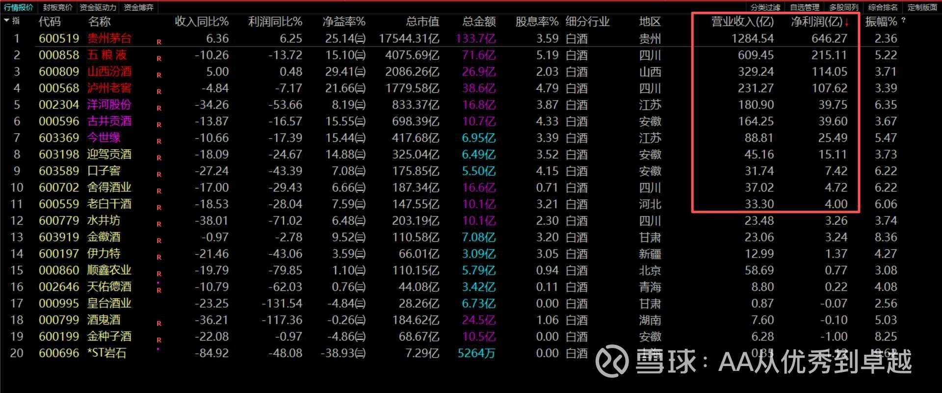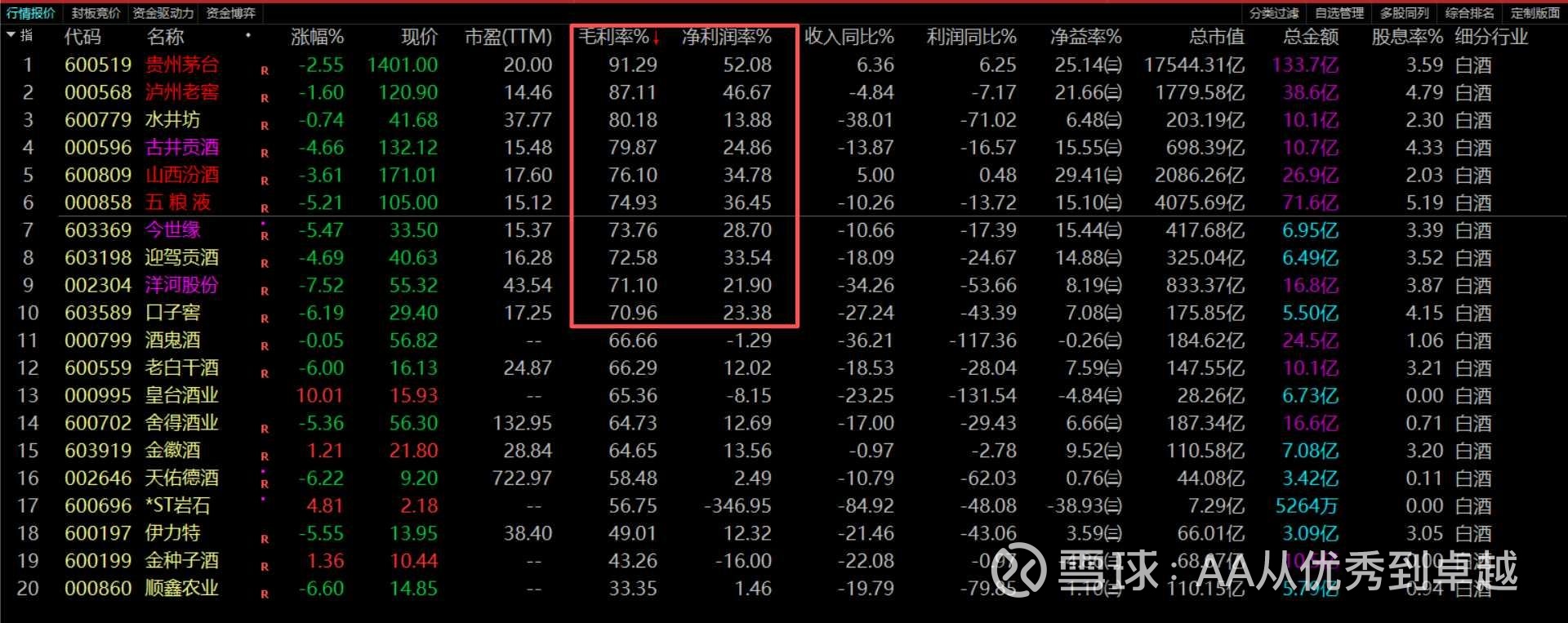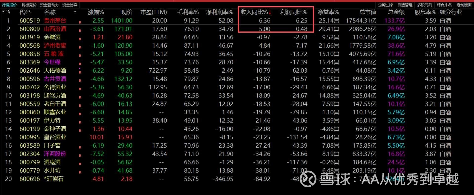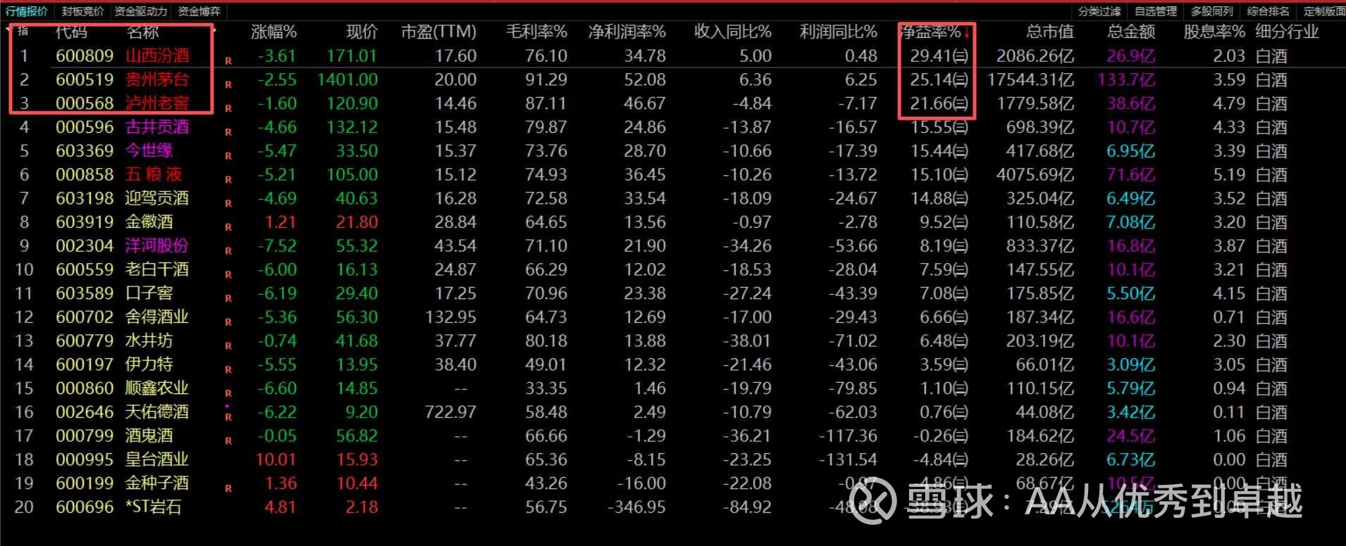 净资产收益率(ROE/净益率)超过20%的,只有三家:山西汾酒(29.41%)、贵州茅台(25.14%)、泸州老窖(21.66%)。