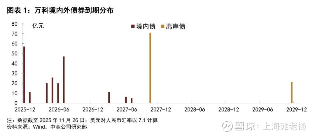 其次是短期债务压力: 万科仍处于偿债高峰期。我们先看一下我找来的最新的中金和wind制作的《万科境内外债券到期分布》统计图,在一年内到期的有息负债占比较高,在销售回款受阻的情况下,集团核心资金池短期内面临明显的兑付压力。