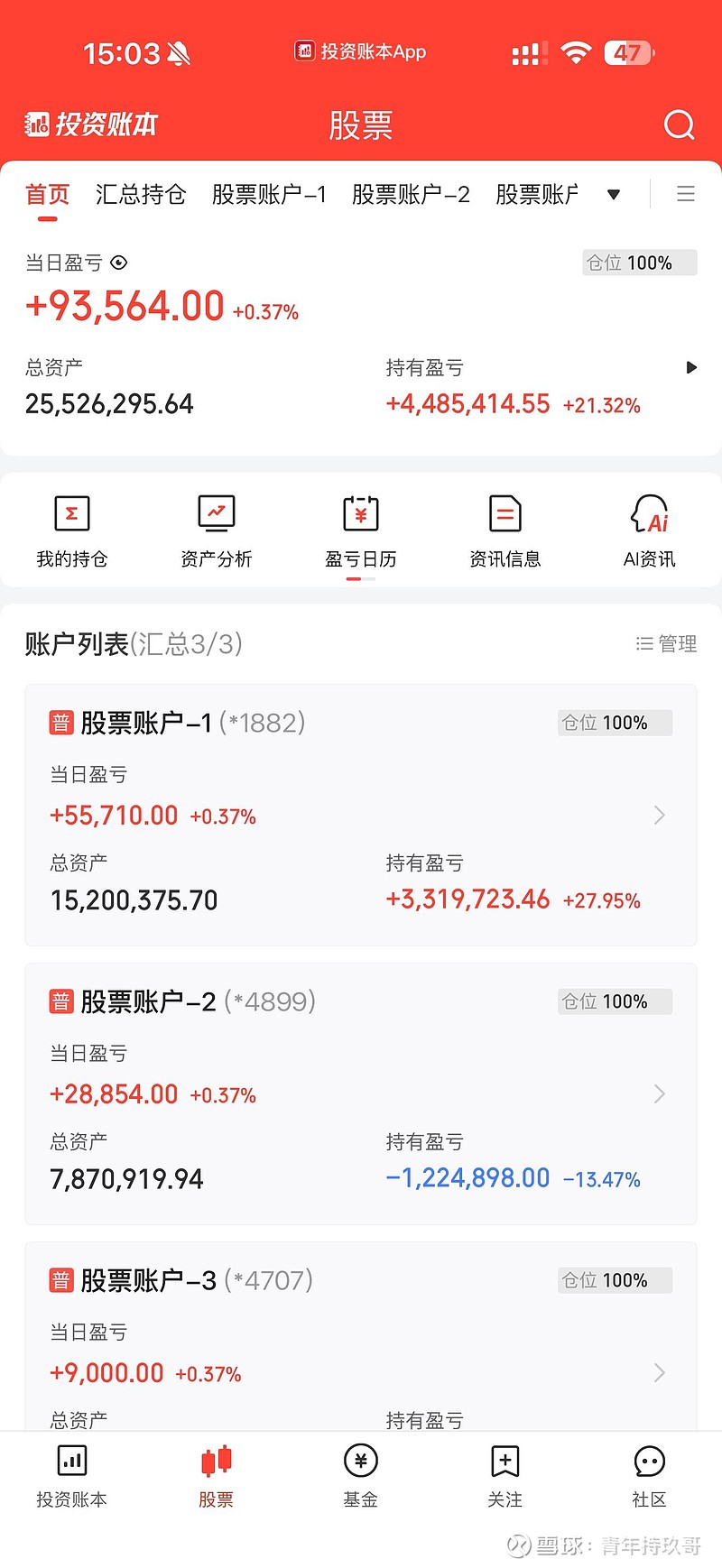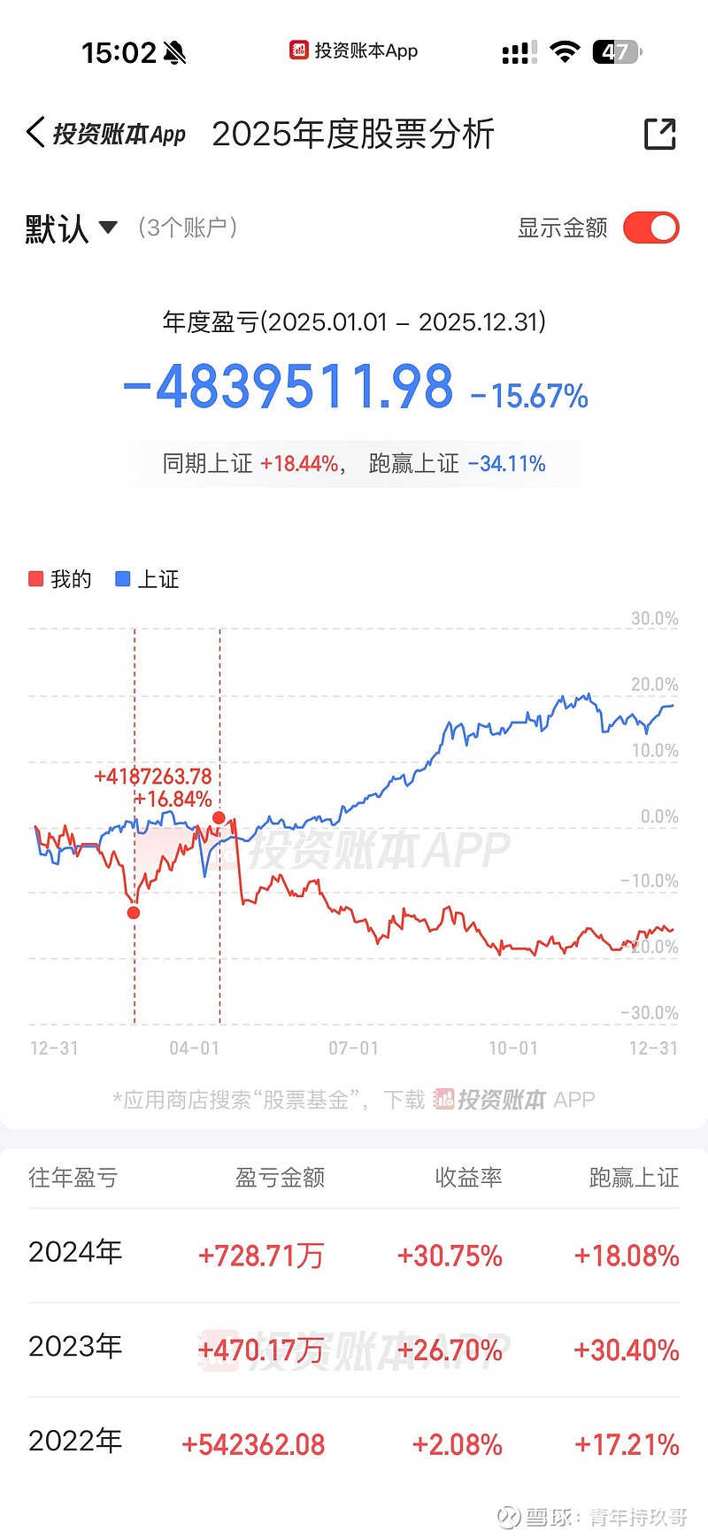 2025年a股总体亏损483万,-15.67%,今年消费股不行,是资源、科技、芯片股的牛市,2026年应该有所好转