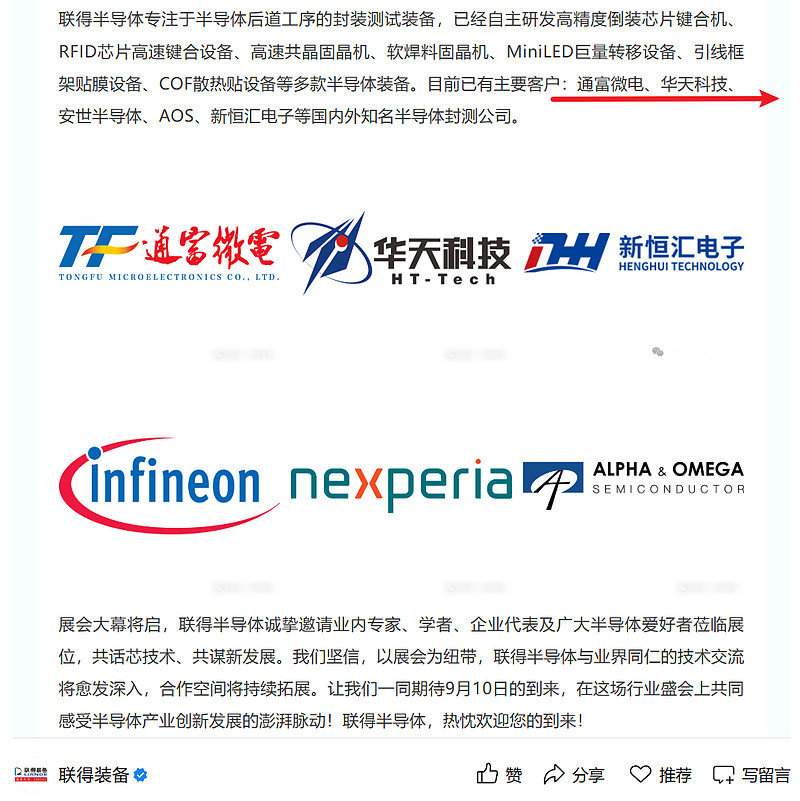 $联得装备(SZ300545)$ 供应通富微电、华天科技封装测试装备