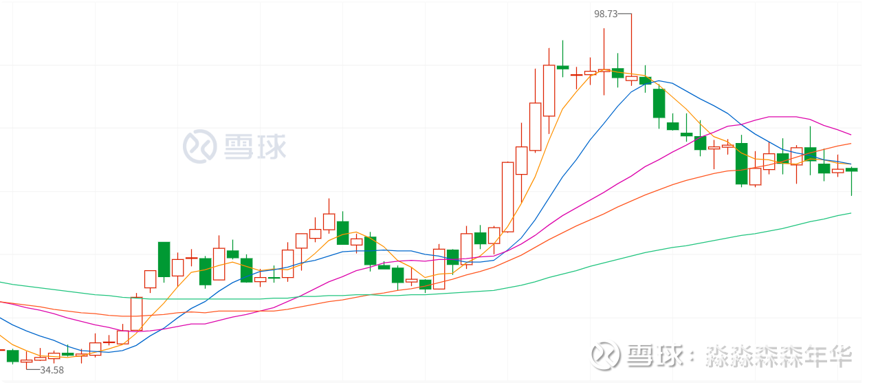 从98.73下来可能是4浪或者3-2浪,怎么判断是哪种呢,那就看有没有跌破一浪的高点65.35,如果跌破65.35,那就是3-2浪,底部是多少不知道,考虑到从高点跌下来33.2%,向下空间最多还有10%。如果能在65.35之上止跌,那就是4浪。