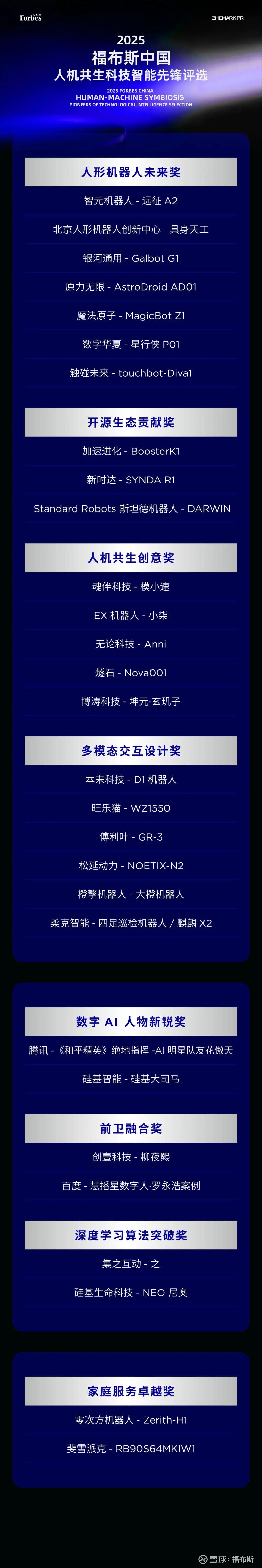 以下为“2025 福布斯中国人机共生科技智能先锋评选”结果: