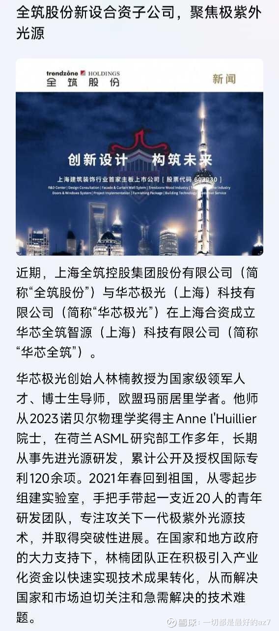 在巩固传统业务优势的同时,全筑股份积极寻求多元化发展,通过合资成立新公司的方式,成功切入新兴科技领域。2025年,全筑股份与华芯极光(上海)科技有限公司携手合资成立了华芯全筑智源(上海)科技有限公司。这一举措标志着全筑股份正式进军极紫外光源核心精密测量设备研发与制造领域,开启了公司发展的新篇章。