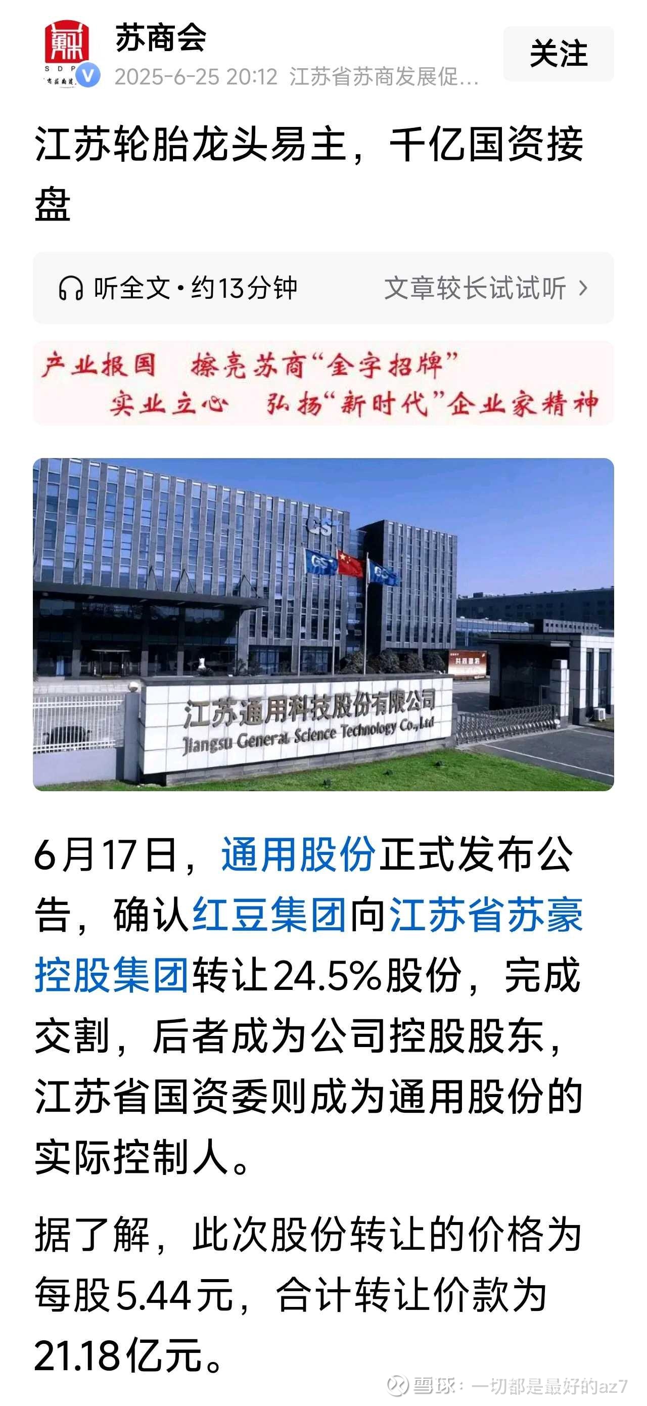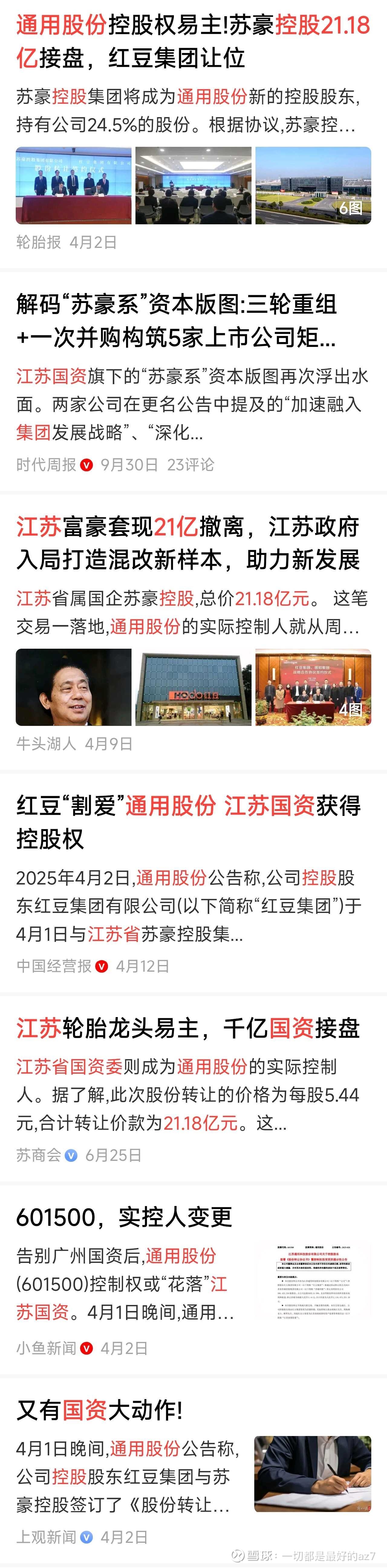 今年6月17日,通用股份完成了一场备受关注的股权变更。控股股东红豆集团向江苏省苏豪控股集团有限公司协议转让24.50%股份(389425230股),过户登记手续顺利完成,江苏省国资委自此成为通用股份实际控制人。此次交易作价高达21.18亿元,每股5.44元 。