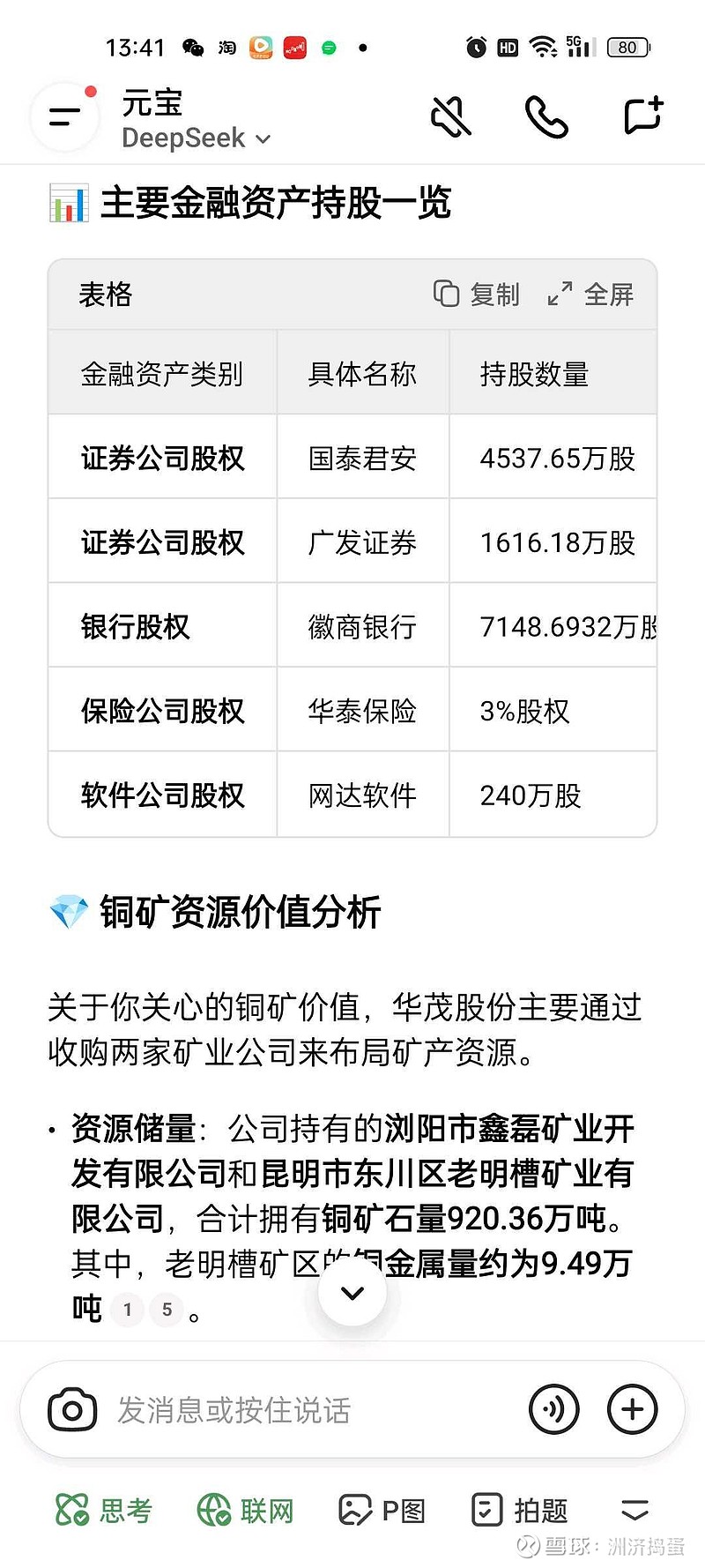 #证券# $华茂股份(SZ000850)$资金发动券商行情,誓要郑志红??10月券商作为市场成交量放大的最大受益者,三季度业绩或迎来史上最好。所以券商先行或预示着三季度业绩炒作开启。另一方面,参股券商相关或迎来相应的资产增值,也值得关注。提供一个案例华茂股份,参股多家金融上市公司,如图,国泰君安,广发证券,以及其他银行,保险资产。另外还有一块核心价值,公司持有两处铜矿资源,受益铜价上涨而增值。