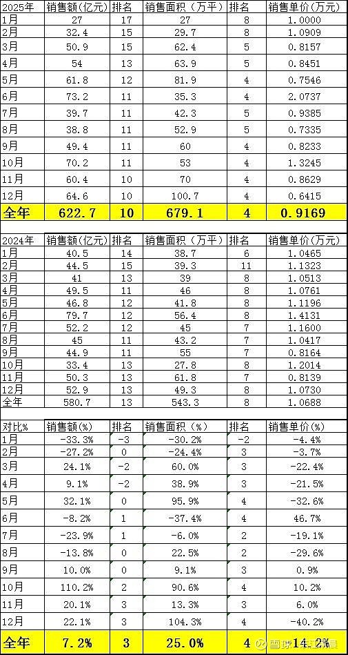 $绿地控股(SH600606)$ 绿地控股2025年全年销售622.7亿元,同比2024年增长7.2%,销售面积679.1万平,同比增长25%,但销售平均单价9169元,同比下降 14.2%,绿地在2025年以价换量,在销售上取得的成绩不错,在行业下降8%的前提下取得正增长实属不易,这对于清库存,回笼资金均有正面、积极的效应,但同时亦应看到,单价的下降则对当年的毛利产生影响,因此,2025年全年亏损超过上年成为现实。