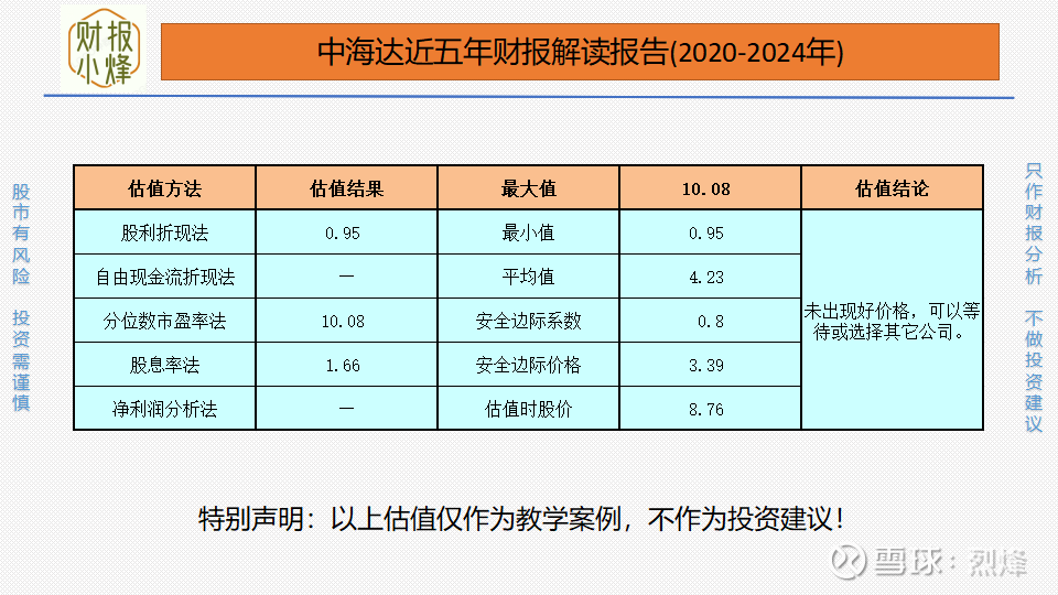 估值会随着市场的变化而变化,应及时调整。请注意估值日期,若时间相隔较远,需重新进行估值。财报分析只是做好投资的第一步,要想保住本金慢慢积累财富,还需要进行企业层面和商业模式的分析,想要学习这方面的技能可以私信小烽或在评论区留言。