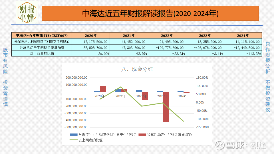 2020年至2024年,中海达的现金分红金额分别为0.17亿元、0.44亿元、0.24亿元、0.13亿元、0.14亿元,现金分红率分别为19.99%、93.97%、-22.31%、-3.11%、-113.38%,整体波动大,分红慷慨度不足,股东回报率低。