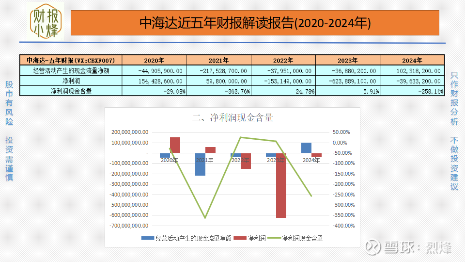 2020年至2024年,中海达的净利润分别为1.54亿元、0.60亿元、-1.53亿元、-6.24亿元、-0.40亿元,净利润现金含量分别为-29.08%、-363.76%、24.78%、5.91%、-258.16%,整体波动极大,现金创造能力弱,净利润含金量低,收获甚微。