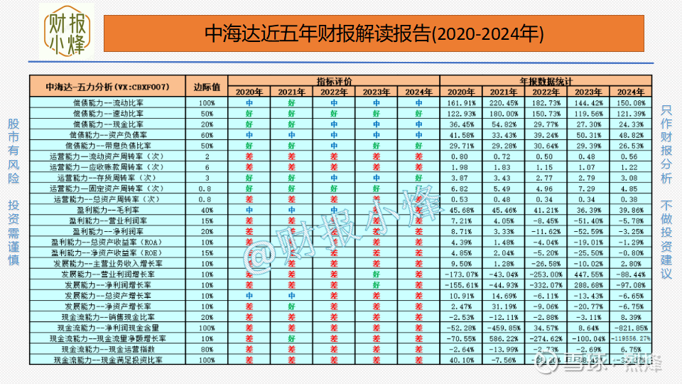 以上是从偿债能力、运营能力、盈利能力、发展能力和现金流能力五个维度整体分析中海达的财务情况,每个维度又包含5个具体的财务指标,总共25个财务指标(与上面的21个指标有所不同),这些指标的好坏评价如上表一目了然,但还有比较详细的图表和分析结论,请在五力分析板块中查阅。