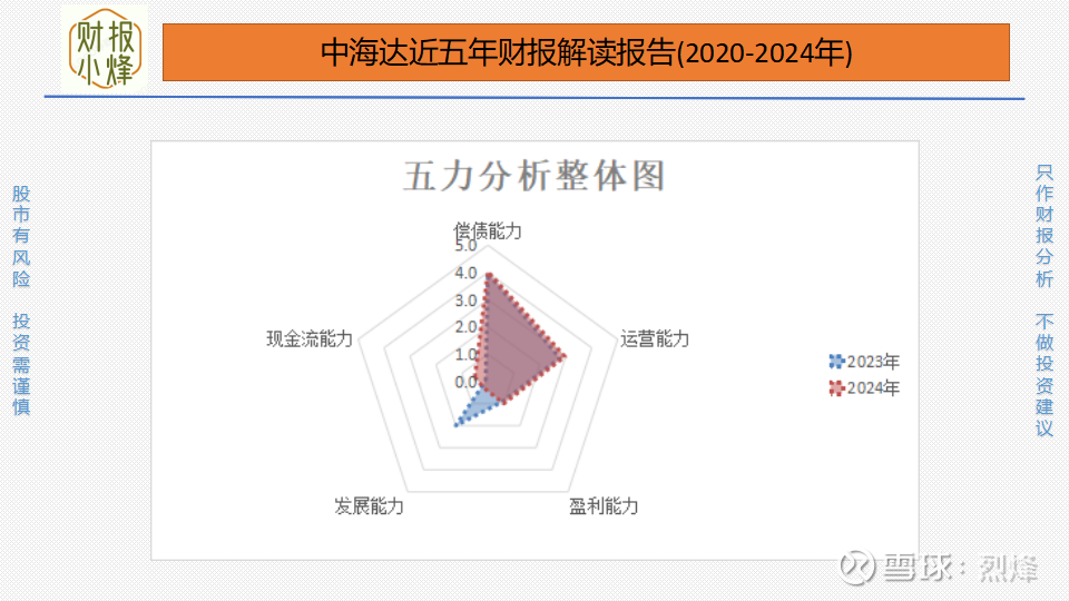 中海达的偿债能力与去年同期相比持平,保持在中高水平;运营能力与去年同期相比持平,保持在中等水平;盈利能力与去年同期相比持平,保持在低水平;发展能力与去年同期相比明显下降,由中低水平下降至低水平;现金流能力与去年同期相比略有提升,但仍保持在低水平;整体来看“五力”明显下降。