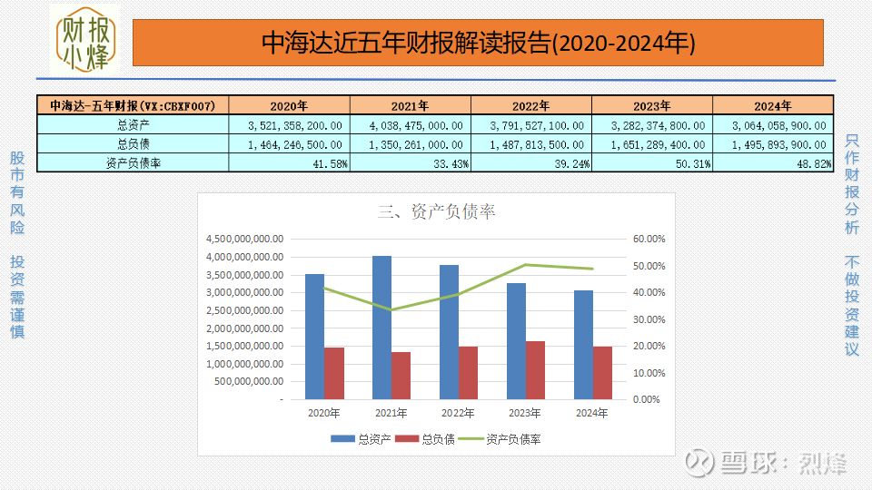 2020年至2024年,中海达的总资产分别为35.21亿元、40.38亿元、37.92亿元、32.82亿元、30.64亿元,总负债分别为14.64亿元、13.50亿元、14.88亿元、16.51亿元、14.96亿元,资产负债率分别为41.58%、33.43%、39.24%、50.31%、48.82%,一直低于60%,但呈波动上升趋势,偿债风险可控,财务结构尚可。