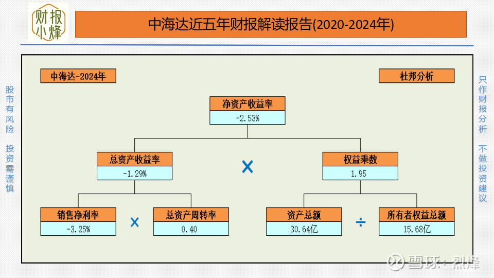 中海达2024年的销售净利率为-3.25%,说明公司的销售净利率非常低,公司的产品不好,盈利能力非常弱,属于低销售净利率的公司;中海达2024年的总资产周转率为0.4,说明公司的管理效率非常低,资金运营的效率也非常低,属于低总资产周转的公司;中海达2024年的权益乘数为1.95,说明公司的财务杠杆较低,负债较低,财务风险也较低,属于低杠杆公司;总之,中海达公司属于低销售净利率低资产周转率低杠杆公司。
