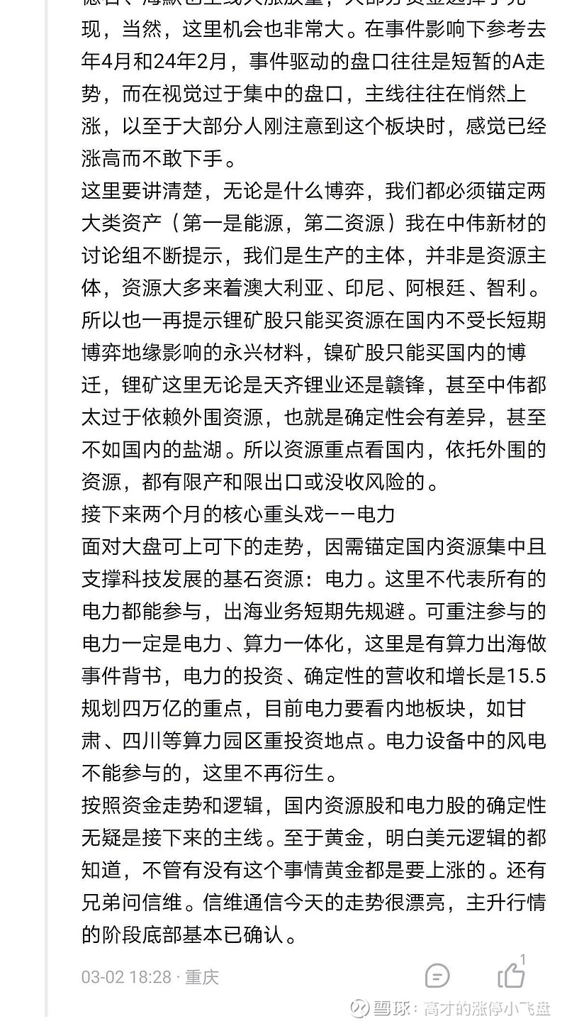 #上证指数# #深证成指# #中国能建# 博弈如期而至,新一轮的贸易摩擦即将开始,这轮摩擦我们只能锚的电力在3月2日已经给大家分享,看到不少朋友收益比我做得更好,大家共同交流,上一轮摩擦在去年4月是环氧丙烷的化工替代,那么这一轮有更多地区会与我们展开摩擦,这里不细讲,资金选择避险情绪会是进口大缺口的,农业肥料,这里重点关注氮肥、钾肥、尿素。记住,我们只做翻倍逻辑,不去打野一两天就结束的板块,要注重收益扩大的持续性。