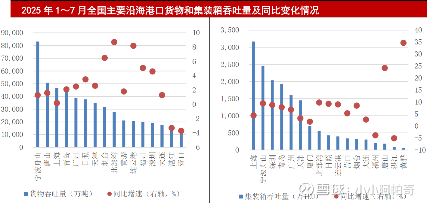 2025 年 1~ 7 月,全国沿海主要港口货物吞吐量实现 66.83亿吨,同比增长 2.9%,全国沿海主要港口外贸货物吞吐量实现 28.85 亿吨,同比增长 2.2%。 货物吞吐量是港口的主要业务量指标, 吞吐量与装卸费率是影响港口收入, 进而影响利润的关键因素。
