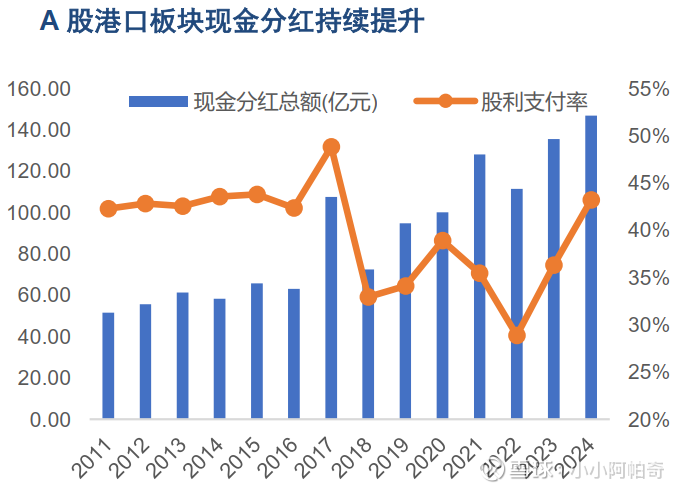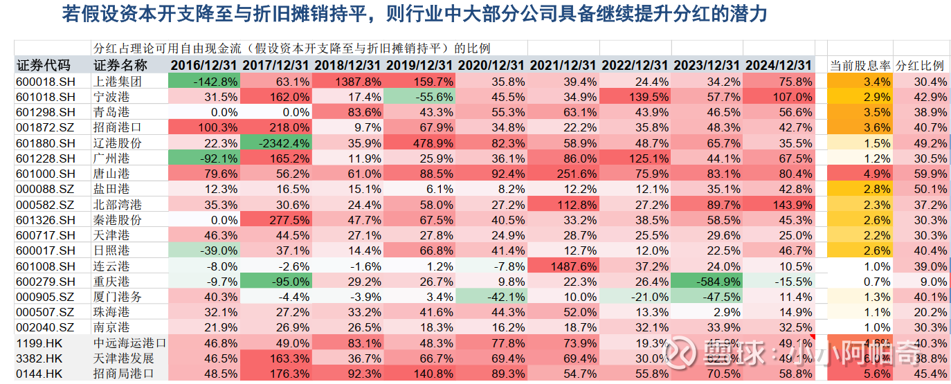 港口企业有较为稳定的现金流,可以从财务指标角度考虑港口未来是否具备提升分红的潜力,测算港口目前分红金额占其自由现金流的比例,该比例越高,则潜力越小;若占比很低,则说明企业现金流充裕,具备提升分红的能力。