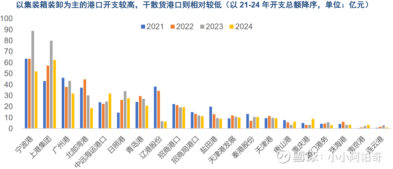 2024年港口企业的资本开支主要集中在宁波、上港等集装箱吞吐占比较大的港口,秦港、唐山港等大型干散货港口资本开支并不大。