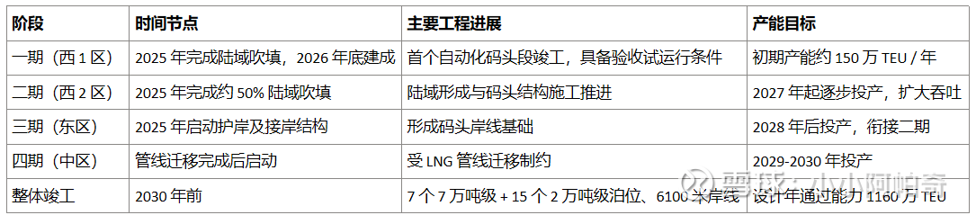 小洋山北作业区集装箱码头及配套工程采用 “整体立项、连续建设、逐段运营” 模式,预计总建设周期约 8 年,分阶段投运节奏如下: