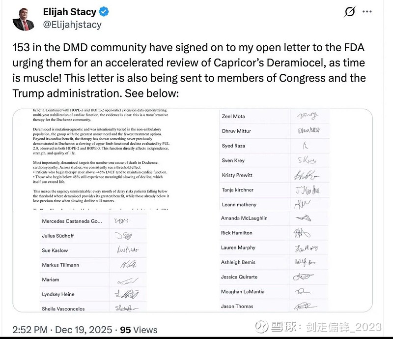 $Capricor疗法(CAPR)$ 对待罕见病,民间呼声不可忽视。正如我先前所言,FDA官员在上任不久后因为敦促Sarepta Therapeutics, Inc. (SRPT)撤回治疗罕见病药物而遭受民间反对而辞职。最近又将罕见病DMD列入早筛项目。表明FDA在政策执行过程中,充分考虑到了民间的声音。对细胞治疗,罕见病创新药是一个利好。今天上午,DMD罕见病患者,民间DMD非盈利团体领袖,知名社会活动人士,eligah stacy,发起了联名信,呼吁FDA、议会和政府加速审批CAPR的基于外泌体治疗DMD药物。CAPR股价应声大涨,也再次证明了CAPR药物的价值以及迫切需求。