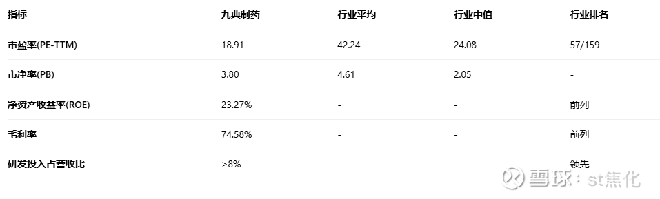 与同行业公司相比,九典制药在估值水平上具备一定优势。根据最新数据,九典制药滚动市盈率(PE-TTM)约为18.91倍,市净率(PB)约3.8倍,市销率(PS-TTM)约3.19倍。这一估值水平低于化学制药行业平均市盈率42.24倍和行业中值24.08倍,表明公司股价可能存在低估。