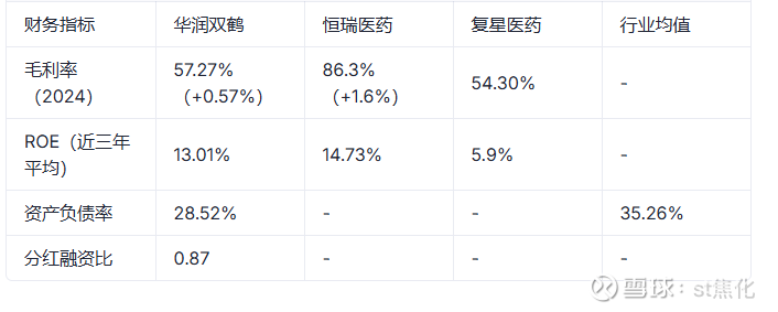 近五年华润双鹤平均净资产收益率(ROE)为13.01%,2024年加权平均ROE达15.07%(同比+13.56%),虽低于恒瑞医药14.73%的水平,但显著高于复星医药5.9%的ROE,体现出稳健的资产盈利能力。股东回报政策保持连续性,2024年度拟向全体股东每10股派发现金红利3.71元(含税),若包含半年度分红,全年现金分红总额占归母净利润比例达30.06%。