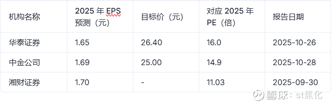 主要机构给予的目标价对应 2025 年 PE 中枢为 14.9 倍,较当前 11.3 倍 PE 存在 31.8%的上行空间。具体来看,华泰证券给予 2025 年 16 倍 PE,目标价 26.40 元;中金维持 25 元目标价,对应 2025 年 14.9 倍 PE。以下为核心机构预测汇总: