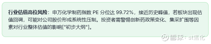 行业估值高位风险:申万化学制药指数 PE 分位达 99.72%,接近历史峰值,若板块出现估值回调,可能对公司股价形成系统性压制。投资者需警惕创新药政策变化、集采扩围等因素对行业整体估值的影响。