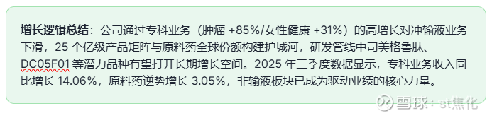 公司正从传统大输液企业成功向综合慢病制药平台转型。2025 年第三季度,专科业务收入同比增长 14.06%,原料药业务收入同比增长 3.05%,这两项业务的良好表现有效对冲了输液业务下滑带来的负面影响,显示公司业务结构优化取得积极成效。