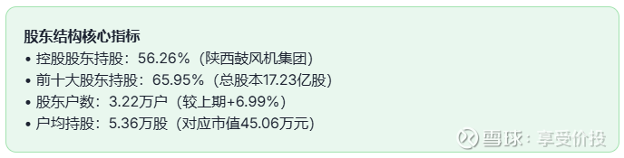 陕鼓动力股权结构呈现“国有控股+适度分散”特征,控股股东陕西鼓风机(集团)有限公司持股比例达56.26%,叠加第二大股东西安工业投资集团(持股5.03%)的关联关系,形成稳定的控制权基础。前十大股东合计持股11.37亿股,占总股本65.95%,股权集中度处于较高水平,为公司战略决策连贯性提供制度保障。截至2025年9月30日,公司股东户数为3.22万户,较上期增加6.99%,户均持股5.36万股,对应持股市值45.06万元,筹码集中度适中,显示中小股东结构保持动态平衡。