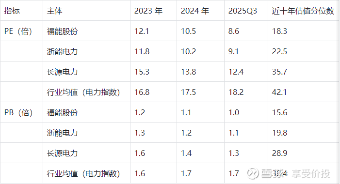 横向自身对比:福能股份 PE 从 2023 年 12.1 倍降至 2025Q3 的 8.6 倍,PB 从 1.2 倍降至 1.0 倍,估值持续下行且处于近十年 15%-18% 的极低分位,主要因市场担忧短期营收下滑,但忽略了盈利韧性与成长潜力,估值安全边际显著。