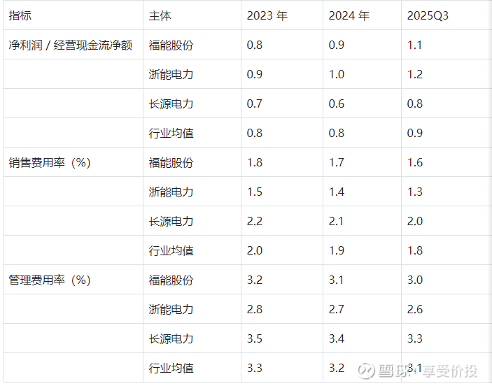 解析:收益质量持续改善,2025Q3 净利润现金流比达 1.1,高于行业均值,显示盈利含金量提升;三费控制成效显著,销售费用率与管理费用率均低于行业均值及长源电力,接近浙能电力的优秀水平,运营效率优势明显。