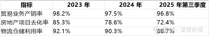贸易业务产销率保持高位,体现公司较强的市场消化能力,但受行业需求波动影响略有下滑;房地产去化率持续下降,主要受行业调控、市场需求疲软影响;物流仓储利用率随贸易业务规模调整略有回落,但整体维持较高水平。