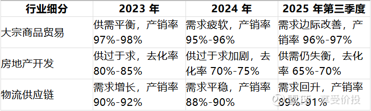 大宗商品贸易受全球经济波动影响,需求先抑后扬;房地产行业供过于求格局未改,去化压力持续;物流供应链需求与贸易、制造业联动,整体保持稳定。