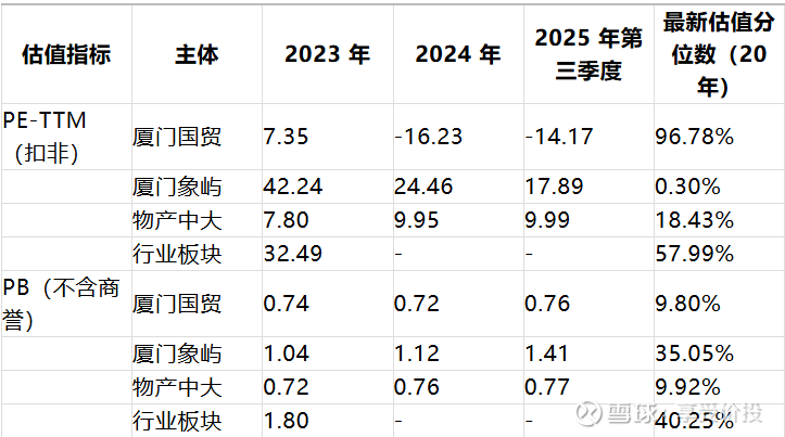 纵向对比竞争与行业:PE 方面,厦门国贸当前估值虽为负,但剔除房地产亏损后,核心贸易业务 PE 低于行业板块(32.49)及厦门象屿(17.89),仅略高于物产中大(9.99),具备估值修复潜力;PB 方面,公司当前 PB(0.76)低于行业板块(1.80)和厦门象屿(1.41),与物产中大(0.77)基本持平,且估值分位数(9.80%)处于历史低位,显著低于行业的 40.25%,低估特征明显。