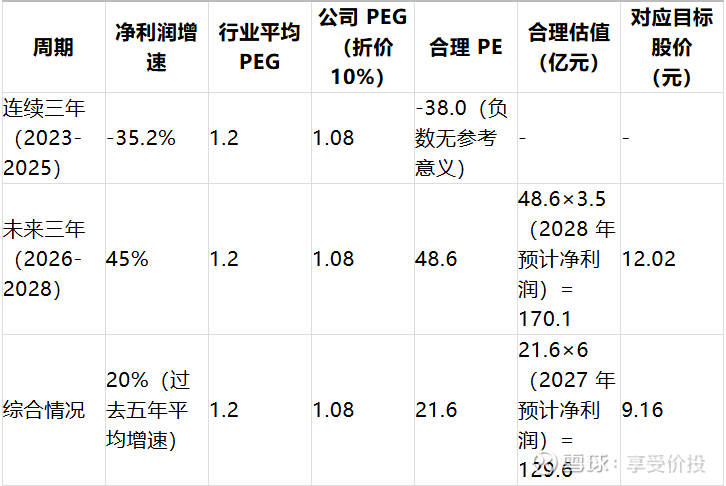 综合 PEG 模型测算,公司合理目标股价区间为 9.16-12.02 元。