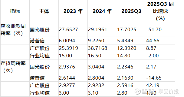 从 2025Q3 财务数据看,国光股份应收账款周转率(-51.70%)、广信股份营收(-23.69%)/ 扣非净利润(-13.99%)、诺普信扣非净利润(+37.61%)为同比变化最大的核心数据,其中国光股份的应收账款周转率是自身核心变动指标,以下重点解析国光股份同比变化较大的数据,解释变动原因并判断影响程度:
