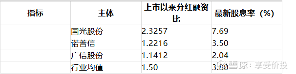 纵向对比:上市以来分红融资比 2.3257,意味着公司分红金额是融资金额的 2.33 倍,远高于行业均值(1.50)和两家竞争对手;最新股息率 7.69%,是行业均值(3.80%)的 2 倍,为三家企业中最高;