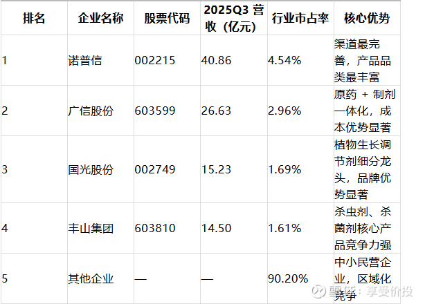 国内农药制剂行业按营收规模排名,2023-2025Q3 头部企业格局保持稳定,诺普信、广信股份、国光股份位列前三,均为 A 股上市公司,市占率均低于 6%,行业仍无绝对龙头;植物生长调节剂细分领域,国光股份位居第一,龙头地位稳固。具体排名如下: