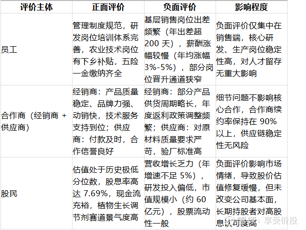 通过梳理职场平台(脉脉、智联)、经销商合作平台、股票社区(东方财富股吧、雪球)的公开评价,从员工、合作商、股民三个维度总结如下,整体评价中性偏正面,负面评价集中在细节问题,对公司核心运营无重大影响: