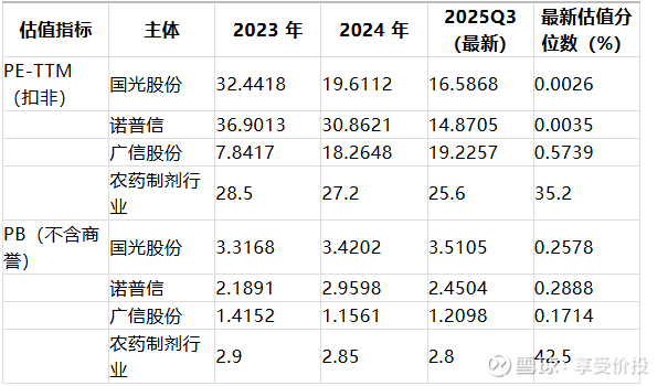 注:估值分位数表示当前估值在历史区间的位置,0% 为历史最低,100% 为历史最高;国光 / 诺普信 / 广信分位数为上市以来分位数,行业为 20 年分位数。